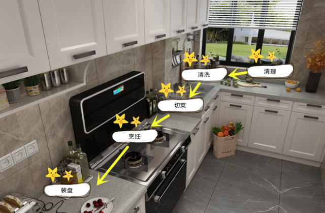 10、厨房的动线:拿(冰箱)---放---洗---切---炒---摆;台面一定要按照这个设计。