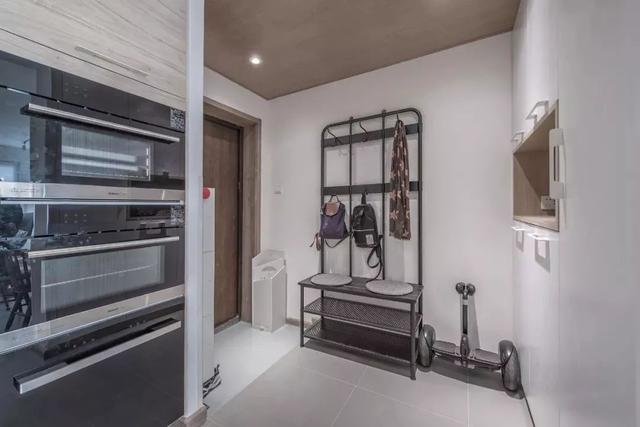 玄关靠墙摆放的衣帽架,是可移动的,挂取衣物包包、出门换鞋都是很方便的。