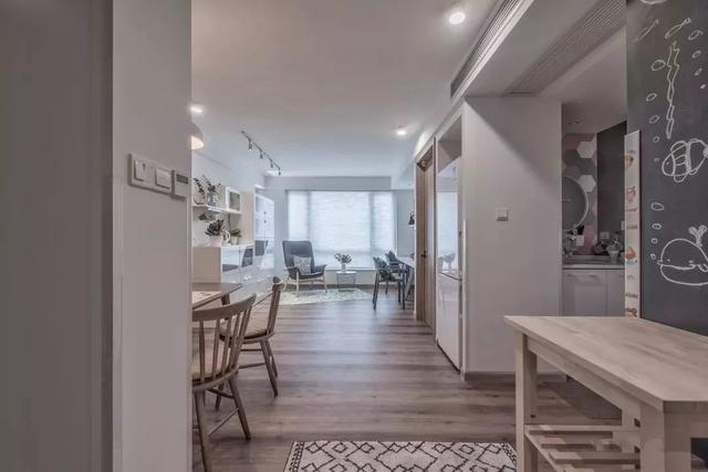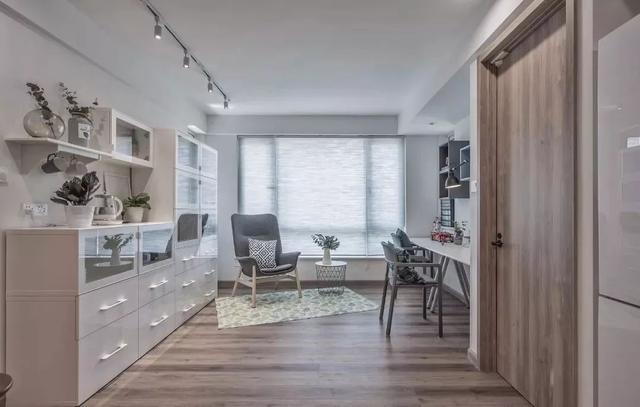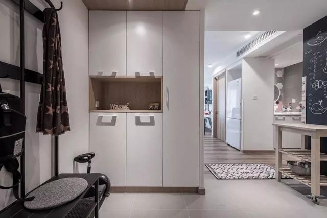白色储物柜的设计,避免了一开门就能将客厅望到底,一定程度上保证了隐私性,同时还让空间的储物能力有所增加。