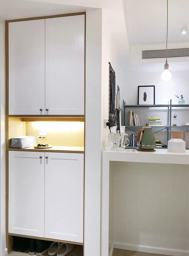 入户玄关走廊处是设计了一个迷你的嵌入式柜子,底部和中间都有留空,还加了藏光的设计,非常实用又美观。