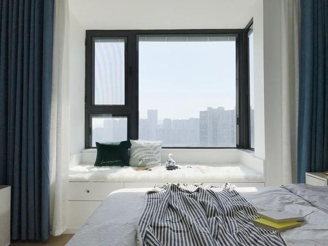 卧室的另一侧是一个飘窗,飘窗底部也是收纳抽屉,垫上坐垫,为屋主放松休闲提供了一个温馨的小角落,满满的都是情调。
