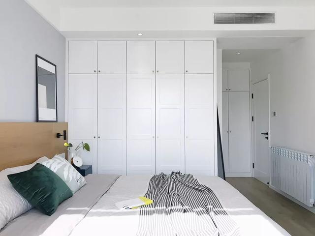 次卧的设计非常简单,浅灰色的床品搭配白色柜子,在加上原木风的床,是北欧风中常见的搭配,非常简约、舒适。