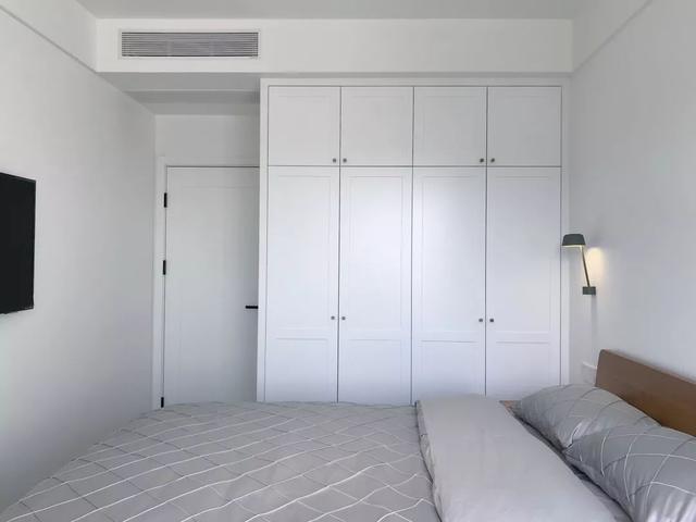 卧室的储物设计非常多,一进门的右侧就做了嵌入式的柜子,靠着床头柜的地方也是满墙的柜子,把卫生间都围在了柜子中间。