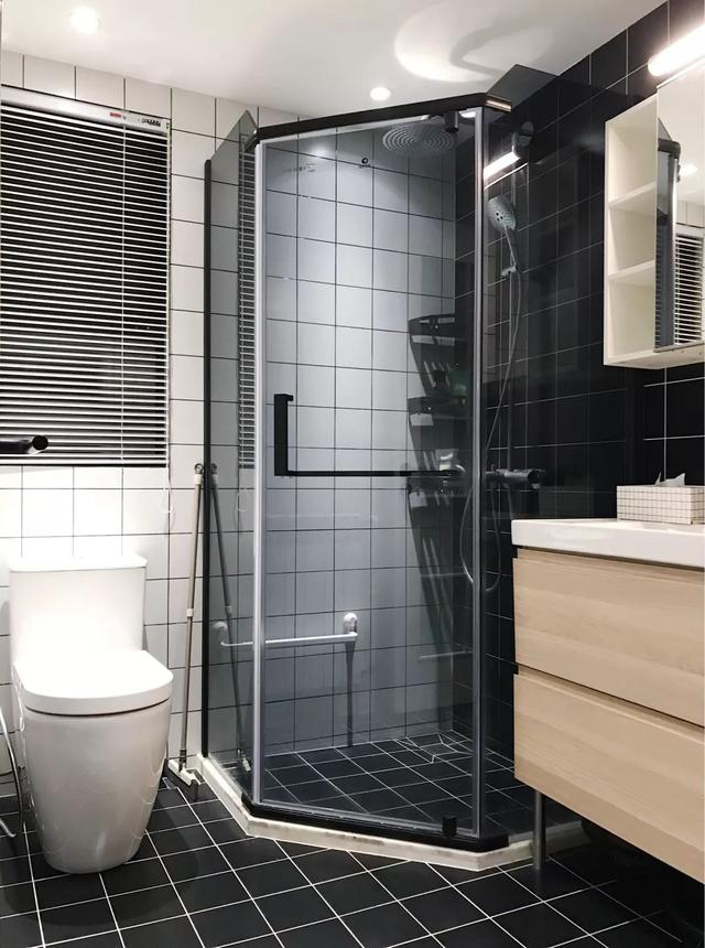 两个卫生间都是一样的布局,在角落里做了钻石型的淋浴房,马桶和洗手台摆放在两侧,黑色和白色碰撞,更加时尚。