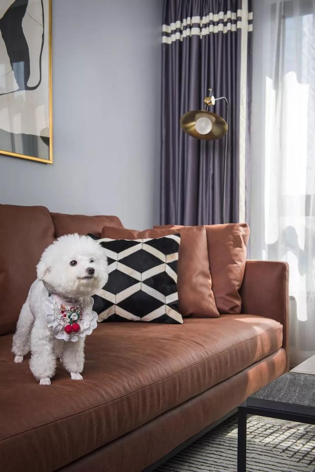 ▲ 一侧的金色落地灯与装饰画的金色画框相呼应,共同勾勒出了精致的品位与格调。沙发柔软的质感,让狗子都感受到了舒服与自在。