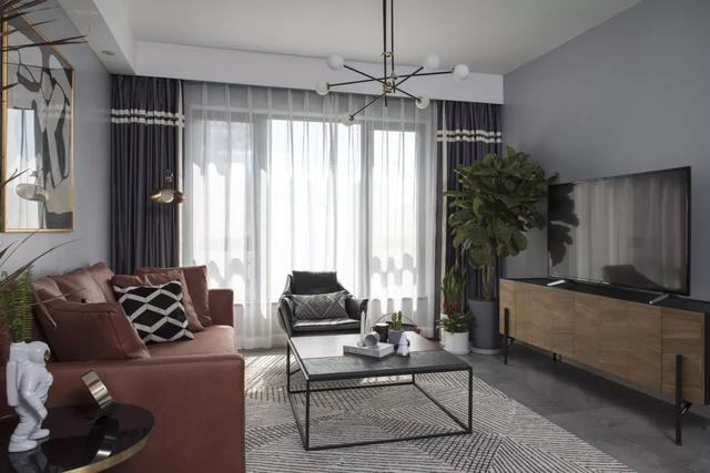 ▲ 客厅,用灰色调作为房间的基调,以焦糖色沙发与黑白交织的抱枕搭配,一种高级感在空间展开。
