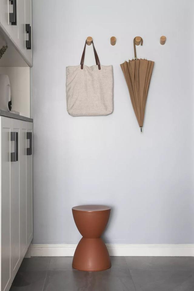 ▲ 开门即见玄关柜,因为空间比较宽敞,所以设计了比较大的柜子,让主人的“战靴”有处可藏。墙面安装了实木挂钩,方便雨伞及衣服、包包的收纳。