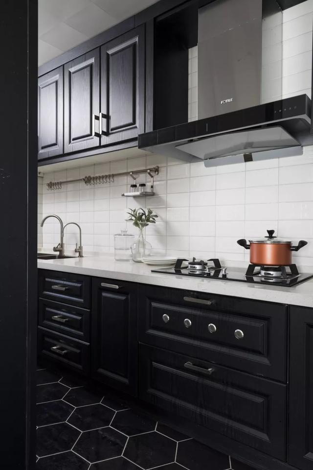 ▲ 厨房地面铺设了黑色的六角砖,并与橱柜色调保持一致。配以白色的墙面砖及操作台面,呈现出一种大气利落又清爽的感觉。
