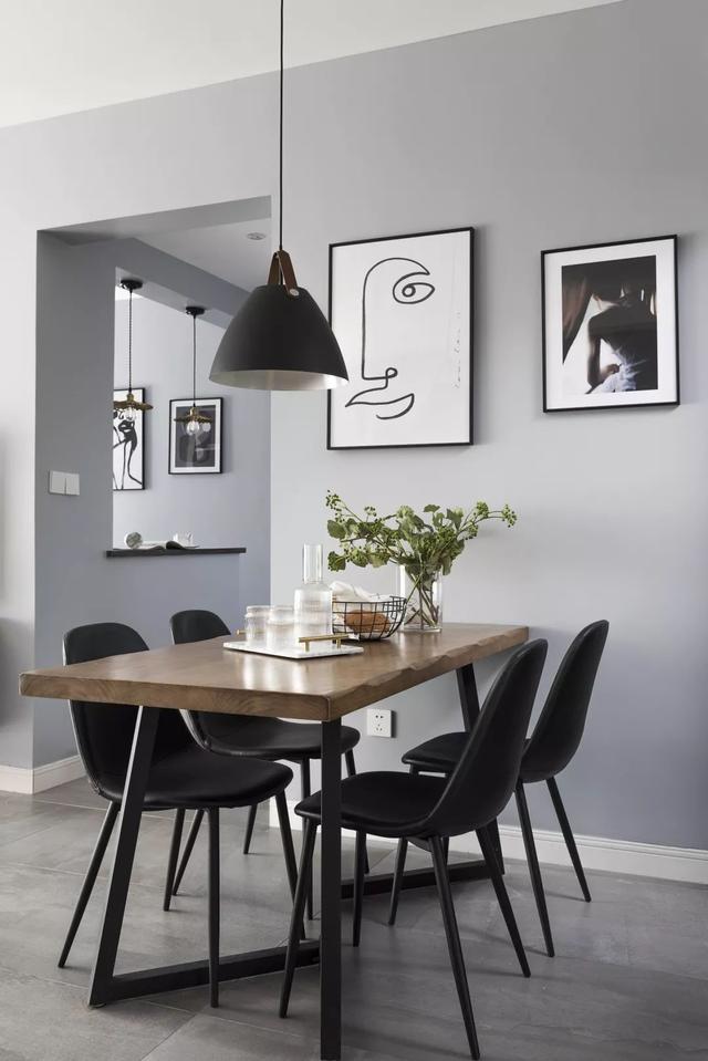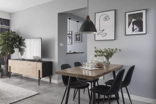 ▲ 餐厅,木质餐桌摆放简单餐具与清新绿意,黑色伊姆斯椅与吊灯相互呼应,墙面两幅装饰画充满了艺术气息,整体沉稳而不失自然格调。