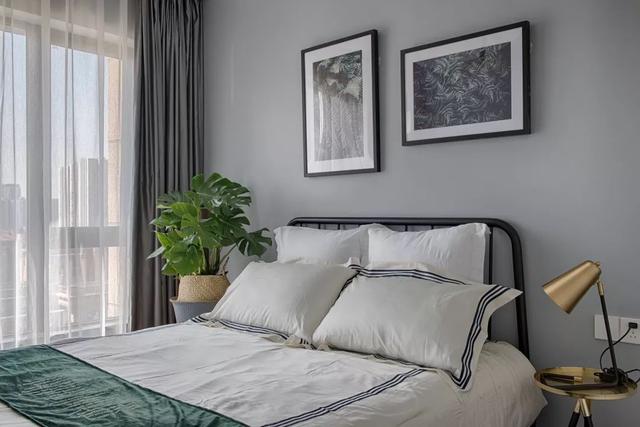 ▲ 次卧墙面选择了低调的灰色,黑色的铁架床搭配白色的床品简单耐看,金色边几与台灯提升质感,加入绿色的盆栽增添自然与活力的气息,细节之处都是点睛之笔。