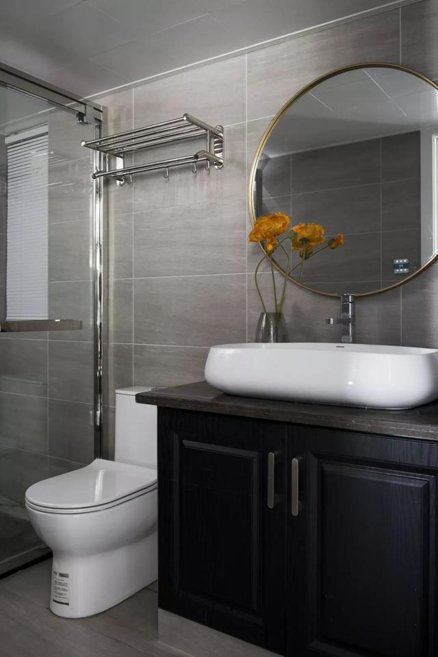 ▲ 卫生间以灰色瓷砖通铺墙地面,简洁优雅。淋浴间采用了透明玻璃的隔断,给人纯净自然的舒适感。