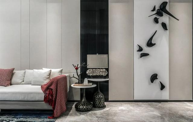 ▲双拼的圆形边几,摆上台灯、干枝装饰,侧边墙面挂上黑色的创意立体造型装饰,使得空间充满文艺端庄的高级气息。