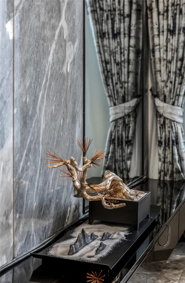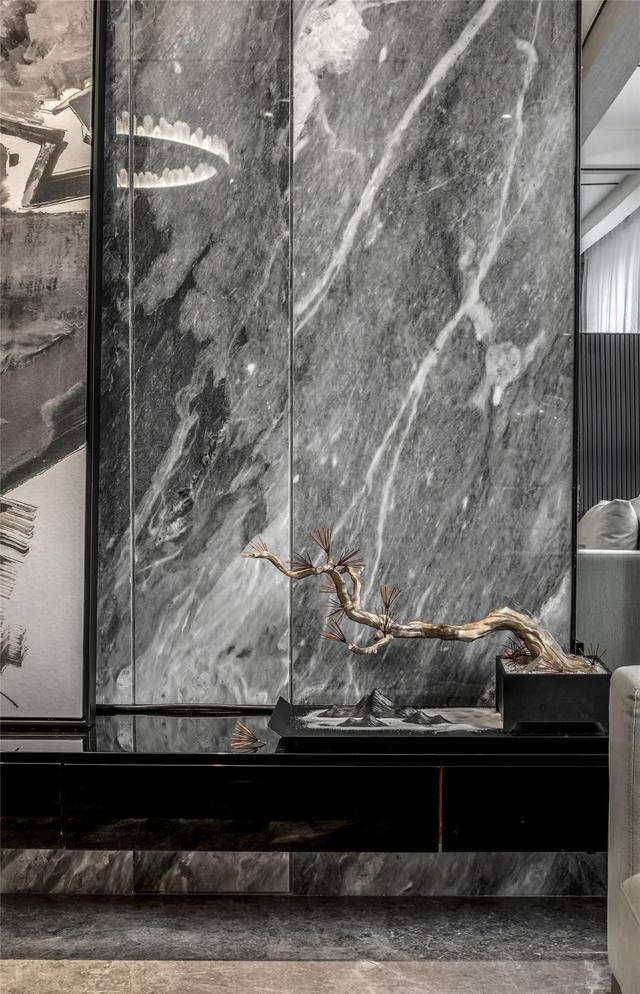 ▲电视墙在岩板背景墙的基础,装上黑色悬空的电视柜,还有一盆干枝盆景,结合假山造型的装饰,带来一个端庄儒雅的视觉氛围感。