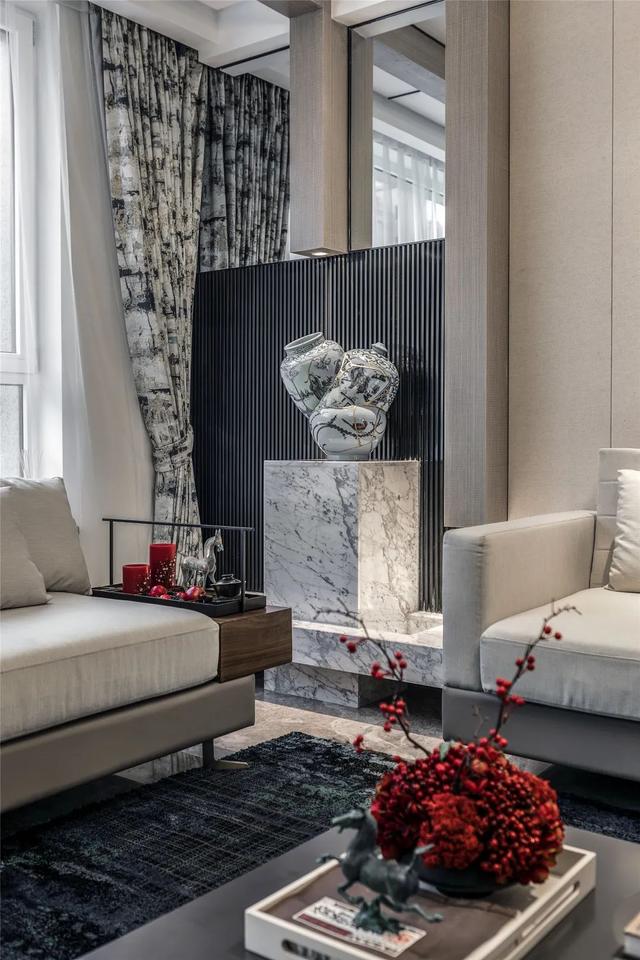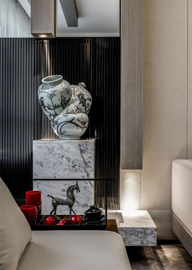 ▲沙发角落位置布置大理石材质的边几,布置陶艺品与骏马摆饰品,加入一抹红色装饰点缀,让空间显得格外的现代时尚而端庄。