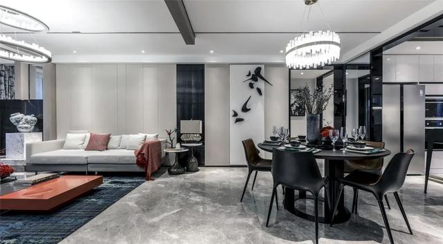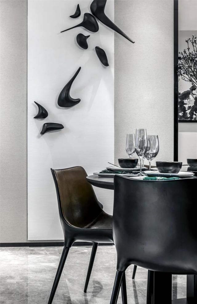 ▲餐厅的踢脚线、门框与墙面上,也是加入了黑色的设计,与黑色餐桌椅呼应,显得更加简练高级。