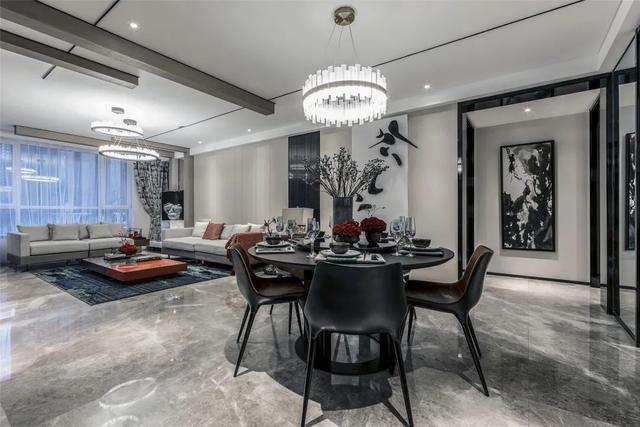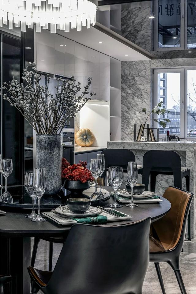 ▲餐厅与客厅连通一体的空间,地面与吊顶都把两个空间做成一体的,布置上黑色的圆餐桌、皮艺餐椅,呈现出一种稳重端庄的高级氛围感。