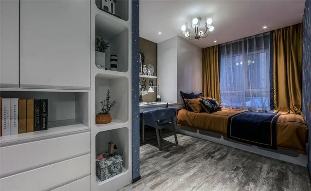 ▲男孩房靠窗位置定制榻榻米床,布置黄色的床单与窗帘,设置书桌、收纳柜,柜子里还有开放格架,布置装饰品,让空间显得格外的精致情趣。