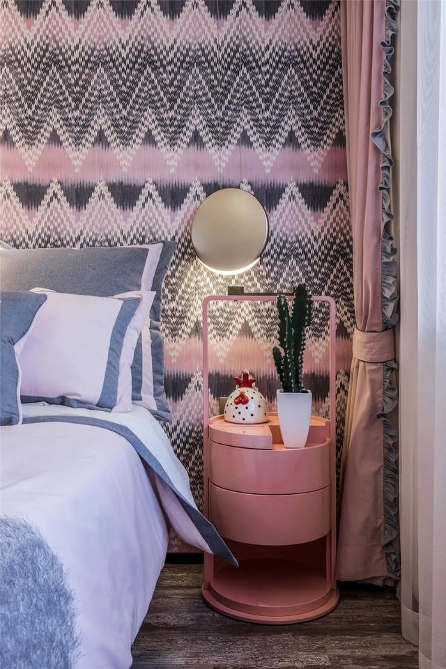 ▲女孩房以波浪纹图案的墙布为床头墙,结合粉灰色的色彩搭配,床头柜是圆桶造型的粉色设计,布置可爱的摆饰品与仙人掌,也让空间充满了童趣活泼而可爱的浪漫气息。