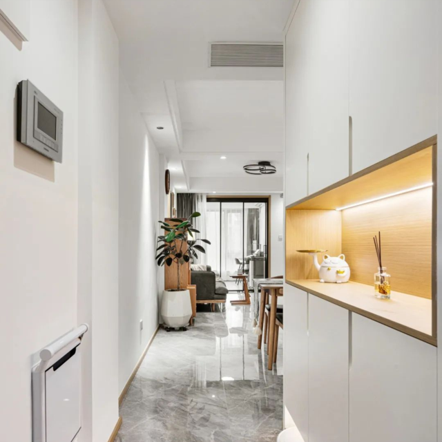 原入户空间狭小,设计师改变厨房门方向,加强空间光线和动线的连贯性。