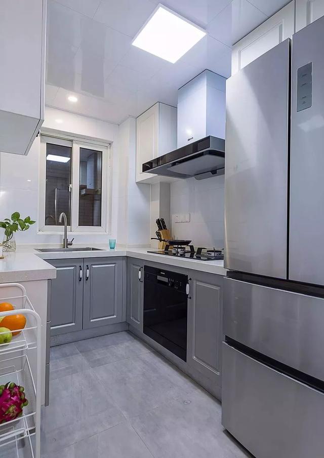 餐厅边上的厨房空间,U字型的橱柜很适合方正的厨房,厨房的角落里还放了个小推车,方便放一些蔬菜、水果。