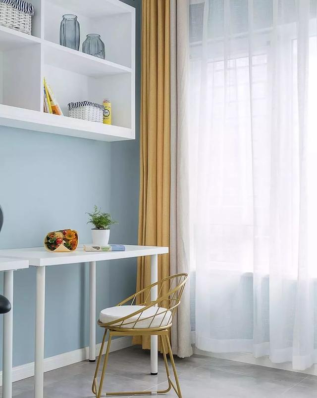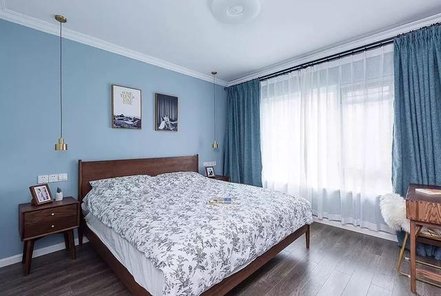 次卧是延续了主体的蓝色作为主色调,而且在小清新的蓝白搭配之中,选择了深木色的家具,让卧室更加的沉稳。