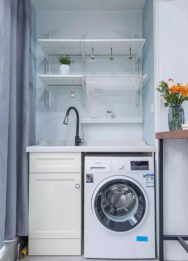 客厅和阳台直接也没有隔断,这样看起来会更宽敞一些。阳台的一侧做了洗衣机、洗手台和隔板架的设计,满足收纳和实用性。