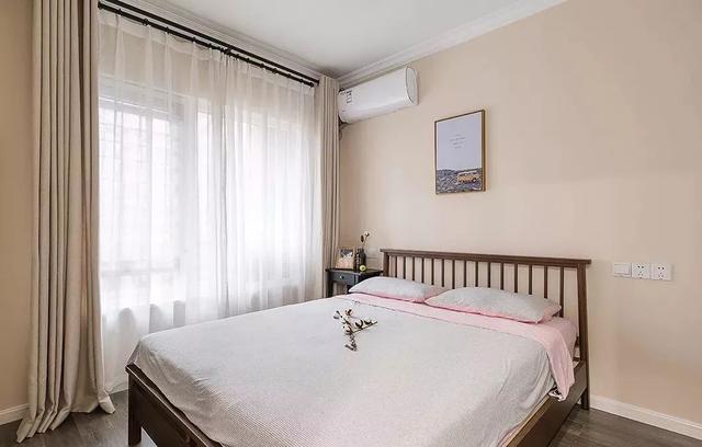 主卧室是选择了更为温馨的米色作为主色调,米色背景墙搭配浅棕色的窗帘和白色的床品,让人感觉非常的舒服。