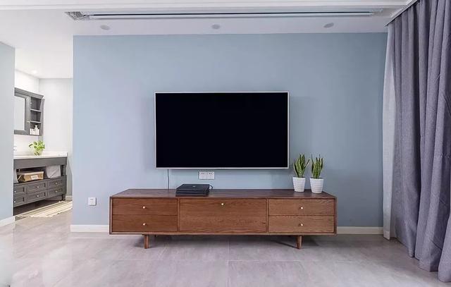 电视背景墙上没有做任何装饰,简单的刷上蓝色乳胶漆就好。客厅的侧边就是卫生间的干区,洗手台刚好被嵌入进了凹槽内。