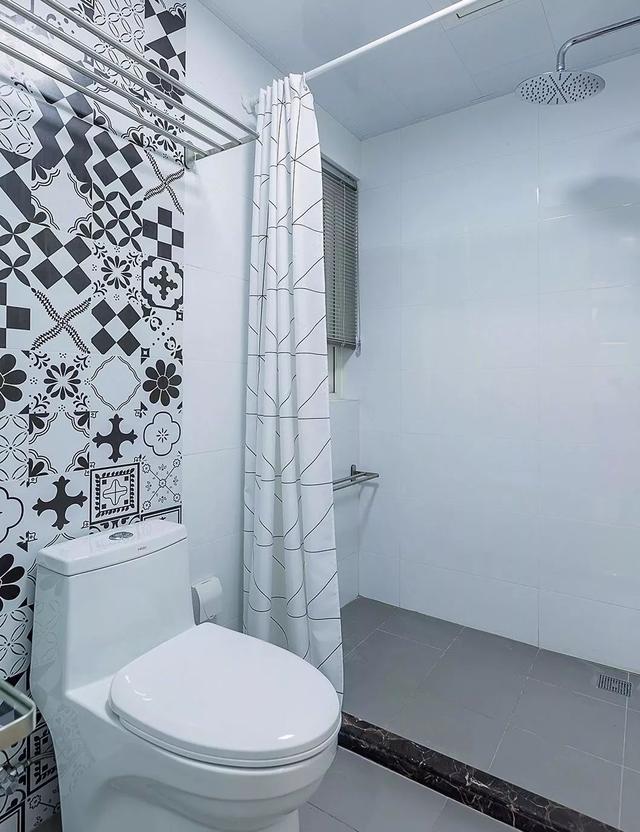 卫生间内部的空间并不算宽敞,用挡水条和浴帘来隔离淋浴区,马桶的背后用花砖作为点缀,让卫生间更加有时尚的感觉。