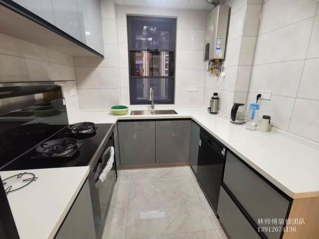 玄关进来是餐厅和厨房,厨房u型设计,储物能力最大化,配菜、洗切、烹饪,动线合理,操作方便。