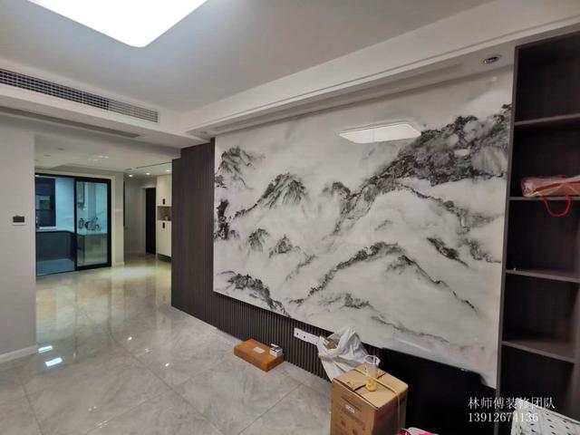 三盛璞悦湾复式装修实景案例,现代中式,水墨画的电视机背景墙中国风超浓的