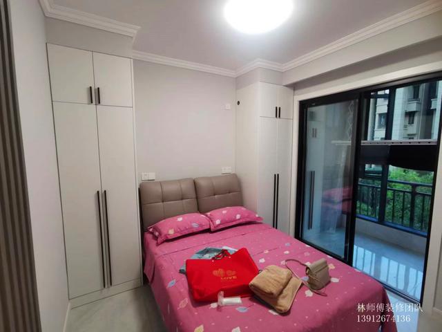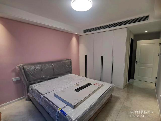 主卧非常的宽敞,粉色的背景墙,也是十分温馨浪漫,还有软包双人大床一看就非常舒适,在这样的环境下睡觉,一定能有个美好的夜晚。