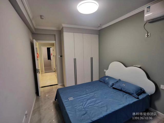 次卧的布置也是非常简约的,蓝色的四件套,静谧安宁。这里要注意一个细节,空调插座是倒装的,更好用哦。