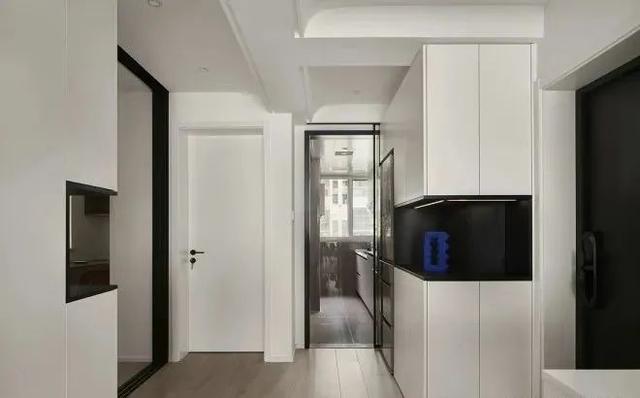 入户拆除原有厨房的一面墙体后,入户空间得以延伸,玄关鞋柜和冰箱柜形成整体造型。抬头可以看到顶部结构,为了藏梁体,做了适宜的弧度,让梁体不显得突兀。