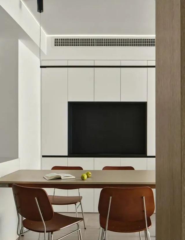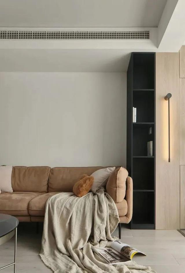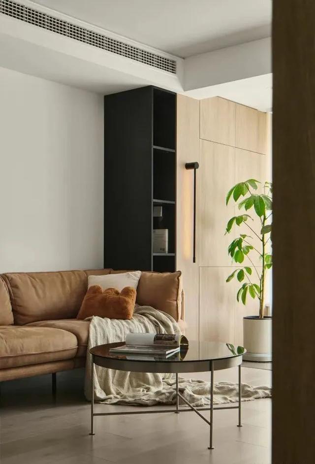 这个角度看阳台木色护墙板隐藏玄机,下面柜门打开后,是空调外机的位置,后续检修没有烦恼,上半部分作为收纳功能,延伸进客厅的,是黑色展示柜,和墙面壁灯一样竖向造型,减弱客餐厅阳台一体带来的纵深感。