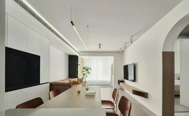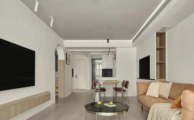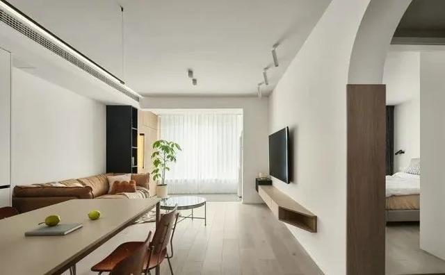 电视柜颜色,高低错落开,做这样的悬挂式设计,也为了方便屋主打扫。