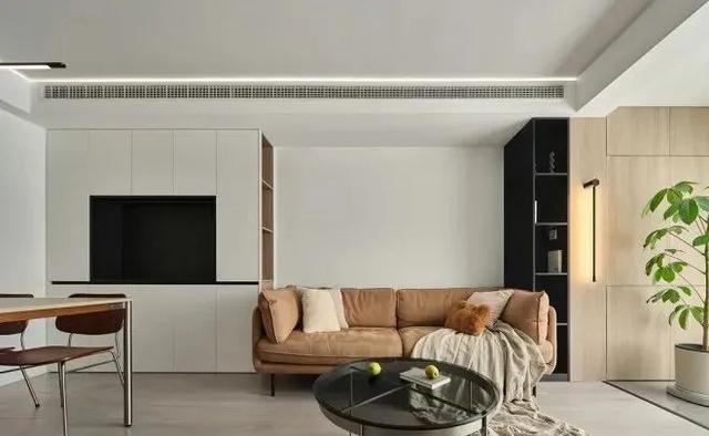 ✔ 客厅阳台合并,阳台一边作为洗衣柜嵌入洗衣机和烘干机,满足洗衣需要,另一边木色的柜子下面藏空调外机位,上面做储物柜;