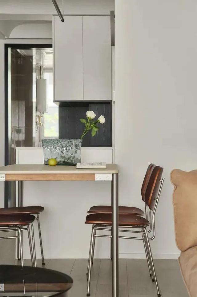 在阳台看客餐厅视角,大面积留白,视线干净,木色点缀更显温馨。厨房的门位置改动后,现在客厅厨房的光线也打开了许多,空间更明亮。