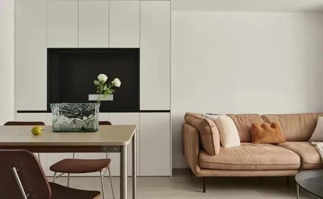 客厅餐厅合为一体,餐桌边制作一组餐边柜,一方面作为储物空间,黑色开放式部分预留插座,方便小家电使用,有时候手机也可以随手放这里充电。