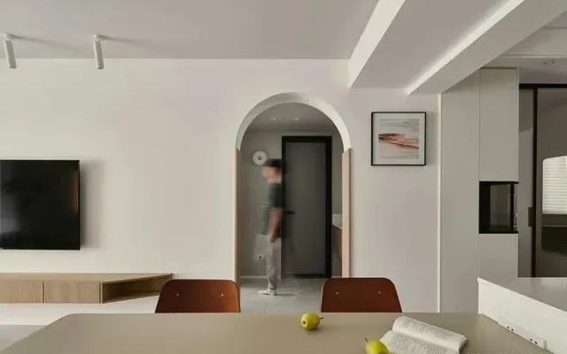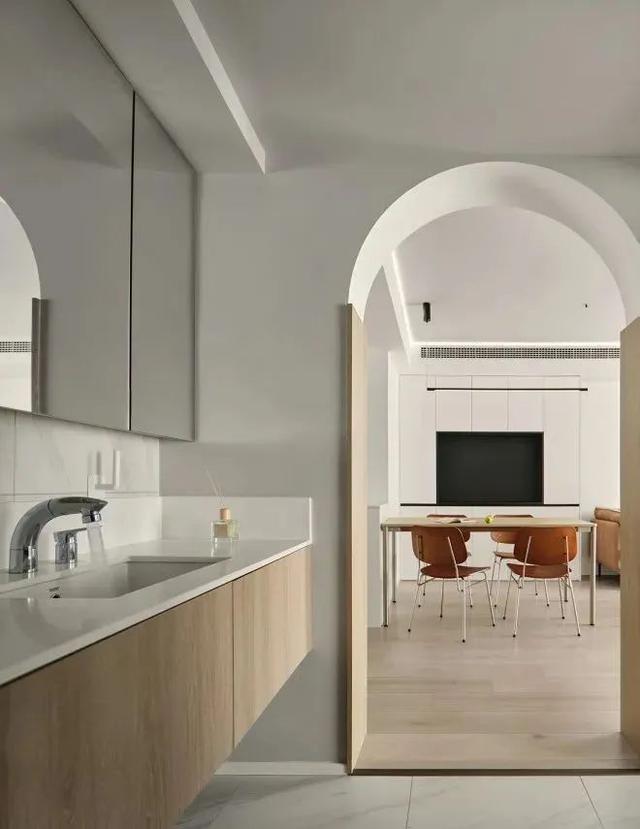 从餐厅角度看拱形门洞和半高的门套,门套为了保护墙面,避免日常生活中的磕磕碰碰,木色带给人温馨感,一切都是无序的,没有特定的,机械地去形态完整。细节的表达蕴藏在这些形态之中,无序而统一。