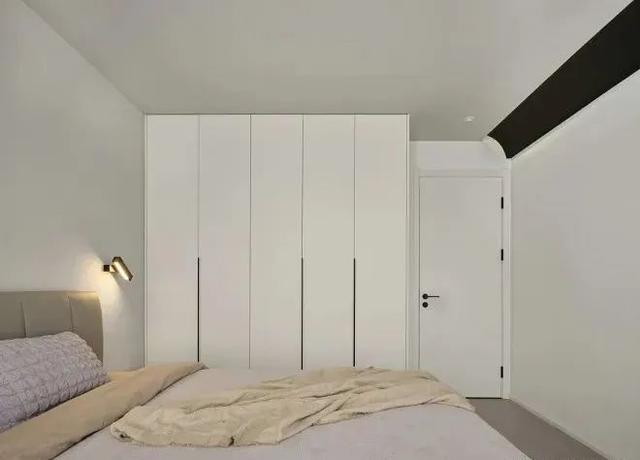 衣柜一门到顶,顶面黑色弧形挂边,这里藏到阳台的管线,风格点到即止,去造型化,营造睡眠空间的简约温馨氛围。