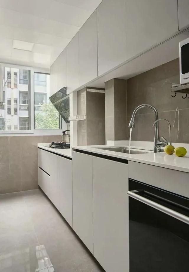 长方形厨房,适合做成这种一字型橱柜,用高低台面,洗菜不弯腰,炒菜不架手,做饭更轻松。