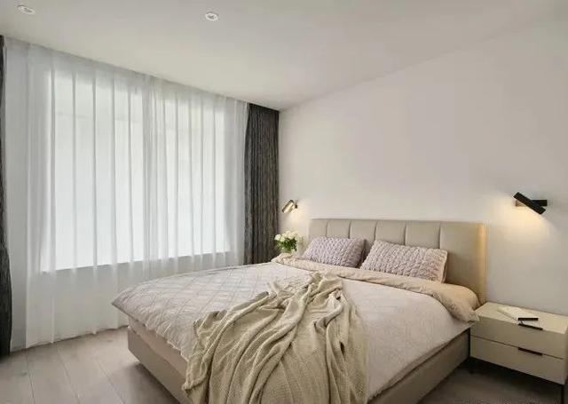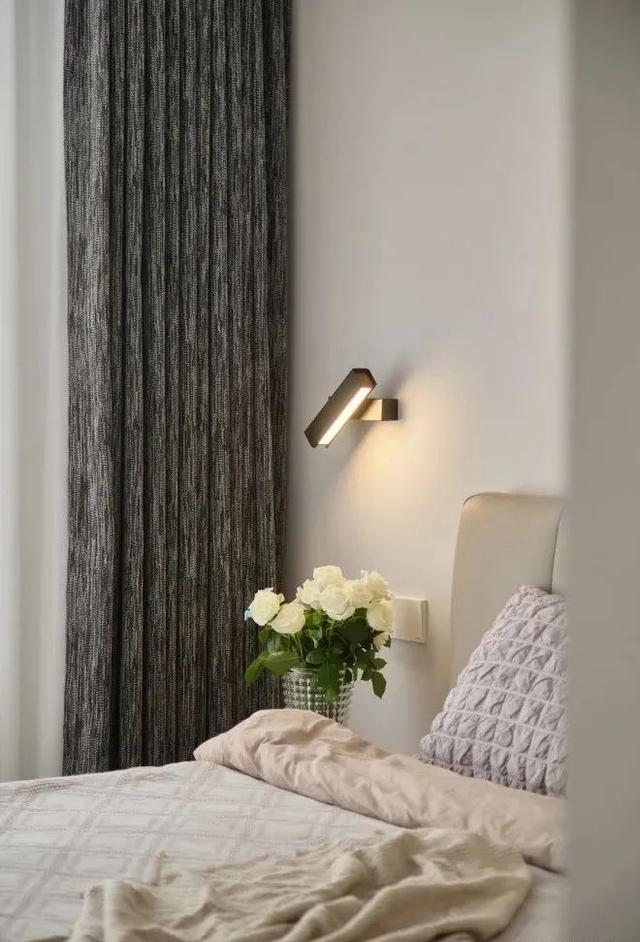 卧室墙顶面灰色漆和客厅统一,加强空间块面感。双层窗帘,既能调节光线,又能保护隐私。