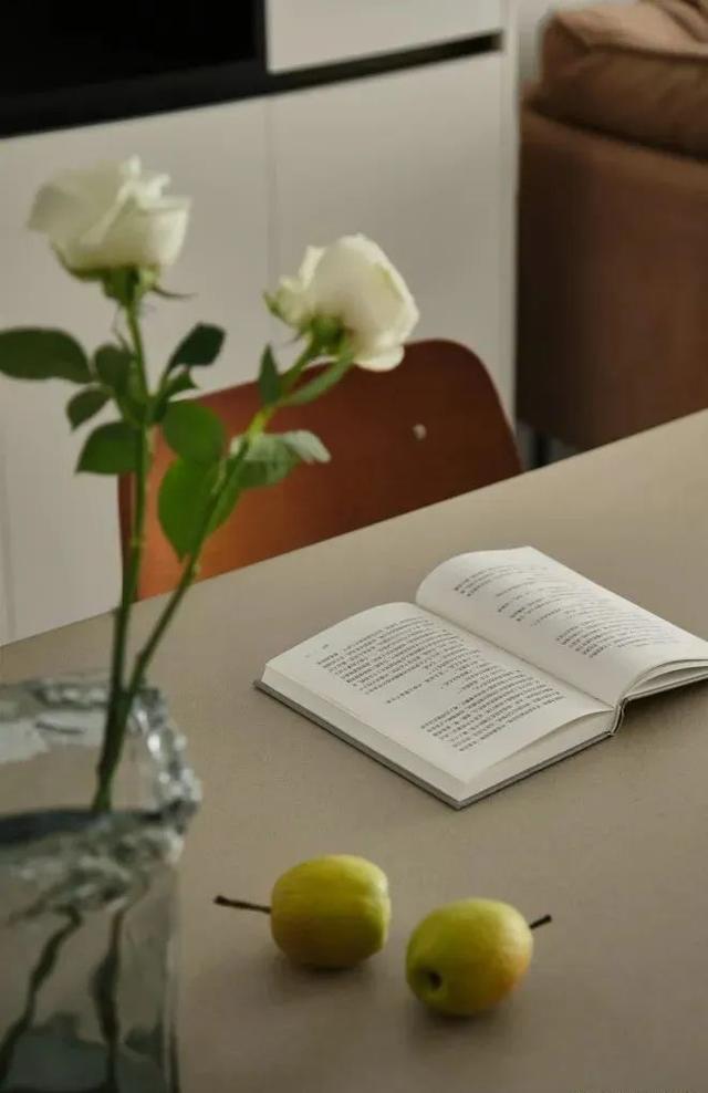 餐桌选择了带有磨砂质感的台面,相比光亮的石材,这种质感显得更有温度一些。
