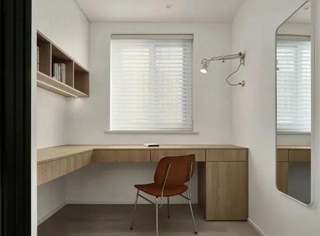 这间由餐厅改造而来的书房,深受业主喜爱,不仅满足办公阅读需求,一面吊柜还能储存不少书籍,一盏工业壁灯,平时可以坐在灯下看书。