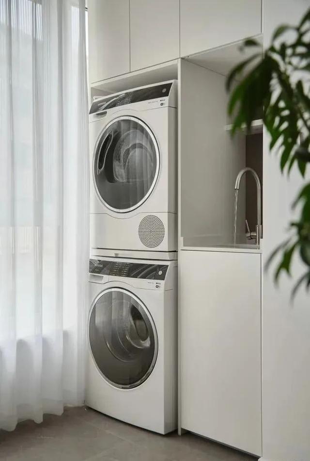 生活阳台定制简约阳台柜,洗衣机烘干机嵌入其中,充分利用空间,保持整体美感,预留一个小水槽,平时在这里洗小物件比较方便。