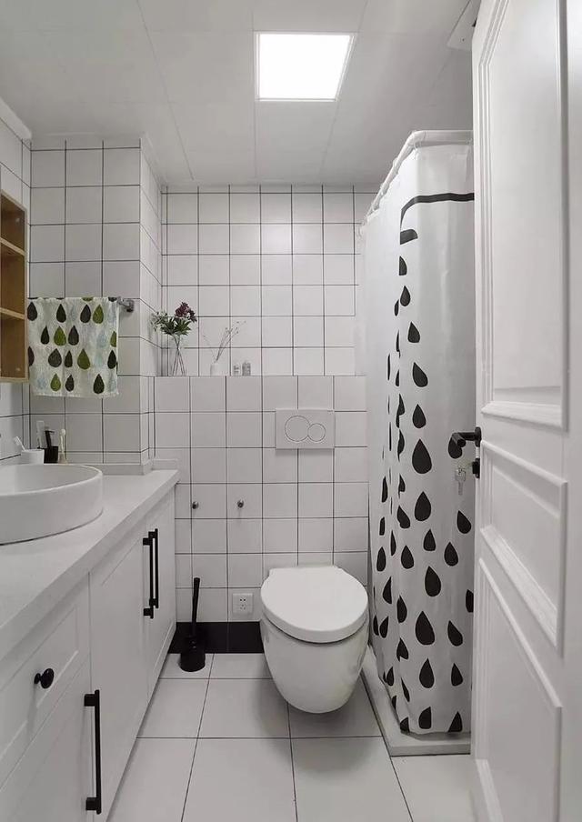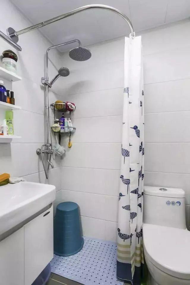小户型的卫生间,做玻璃淋浴房太占空间了,可以考虑做一个漂亮的浴帘,平时不用的时候收起来,能最大程度合理利用空间。