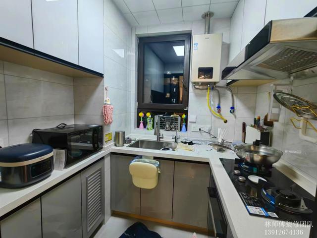 厨房U型设计,上下吊柜,收纳空间非常充足。还有墙壁上的各种收纳架,将整个厨房收拾的井井有条。