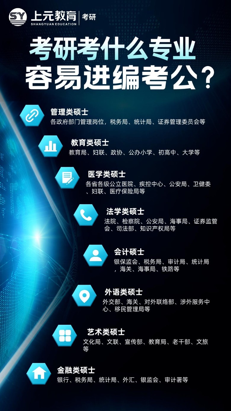 未来想考公务员、事业编考研考什么专业有用、容易考上?以及考什么专业最容易呢?我能考什么学校呢?我该怎么备考呢?欢迎私聊给你提供建议考公最受欢迎的五大类专业详解:财经类专业政府部门对财经类专业学生的需求表现在两大方面:一是财会类,如财政学专业、会计学专业学生;二是经济类,如金融学、国际贸易学等。招录单位主要为:财政局、金融监管部门、社会保障资金管理中心、社会医疗保险管理局、人才就业中心和对外贸易经济合作局等等。相关专业:财政学、国民经济管理、劳动经济、金融学、保险、会计、审计、国际经济贸易、统计类专业等等。法律类专业与本科生相比,读研是法律类专业学生考取司法部门较有力的敲门砖。各大政府单位每年都需要大量法学人才的补充。招录单位主要为:公安系统、人民法院、检察院、劳动人事争议仲裁院、公共交通指挥调度中心、城市管理行政执法局等等。相关专业:法学、经济法、国际法、国际经济法、劳动改造法、民商法、刑事司法、刑法学等等。计算机类专业信息化时代,行政单位公务员的办公越来越趋向于信息化,同时也需要大量计算机类专业人才负责设备维护、系统优化、网络监督管理等等。招录单位主要为:可以选的岗位比较多,比如海关、国税、档案局、网信办等等。相关专业:计算机应用技术、计算机网络技术、计算机多媒体技术、办公自动化技术、网络工程、信息安全、软件工程、电子信息等等。语言文学类专业由于各级机关都存在大量的文字起草工作、以及语言翻译等等专业性人员,尤其是汉语言文学专业,妥妥的“考公大户”。招录单位主要为:国家邮政局、工信部、交通部、出入境、民航总局等。海关、国税、档案局、网信办等等。相关专业:汉语言文学、新闻学、传播学、中国少数民族语言文学、中国语言文化等等。管理类专业管理类专业招录的岗位也比较多。招录单位主要为:商管理局、公共事业管理中心、邮局、政府公共政策部门等。相关专业:管理科学与工程类、工商管理类、农业经济管理类、公共管理类、图书情报与档案管理类、物流管理与工程类、工业工程类、行政管理等。虽然考研并不完全意味着考编,但选择适合的专业非常重要昆山学历提升昆山大专本科昆山自考成考微信电话同步:15365313784抖音:昆山蚊子老师地址:昆山震川西路111号名仕大厦903