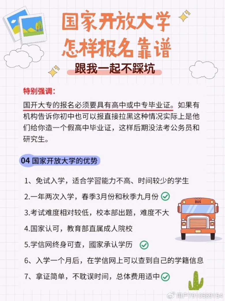 [size=; font-size: inherit,inherit]什么是国家开放大学国家开放大学前身是中央广播电视大学,后在2012年6月21日改名为国家开放大学,隶属于中国教育部,各省份都有分校 [size=; font-size: inherit,inherit]报名条件17周岁以上具有前置学历强调:有些无良机构为冲业绩告诉你什么学历都可以报考,实际上他们给你造假,一经查实,注销学籍已毕业的学生追回毕业证,并且不能考公和考研 怎么报名国开共有两种方式,A到学习中心报名B自己报名A:把自己所需材料提交给学习中心,让他们进行代报名B:官网按照官网的要求提交资料进行操作 国家开放大学优势一年有两次入学机会,分别在3月和9月免试入学学习时间灵活入学后一个月左右就有学籍,相对于成考来说,可以尽快毕业考试难度,校本部出题,更轻松通过考试学信网终生可查,无需担心真实性 国家开大学学习形式学习形式灵活,都是在线上进行授课,期末考试相对自由,适合上班族人进行选择字数限制只能写这么多,有问题的,欢迎大家在评论区讨论
